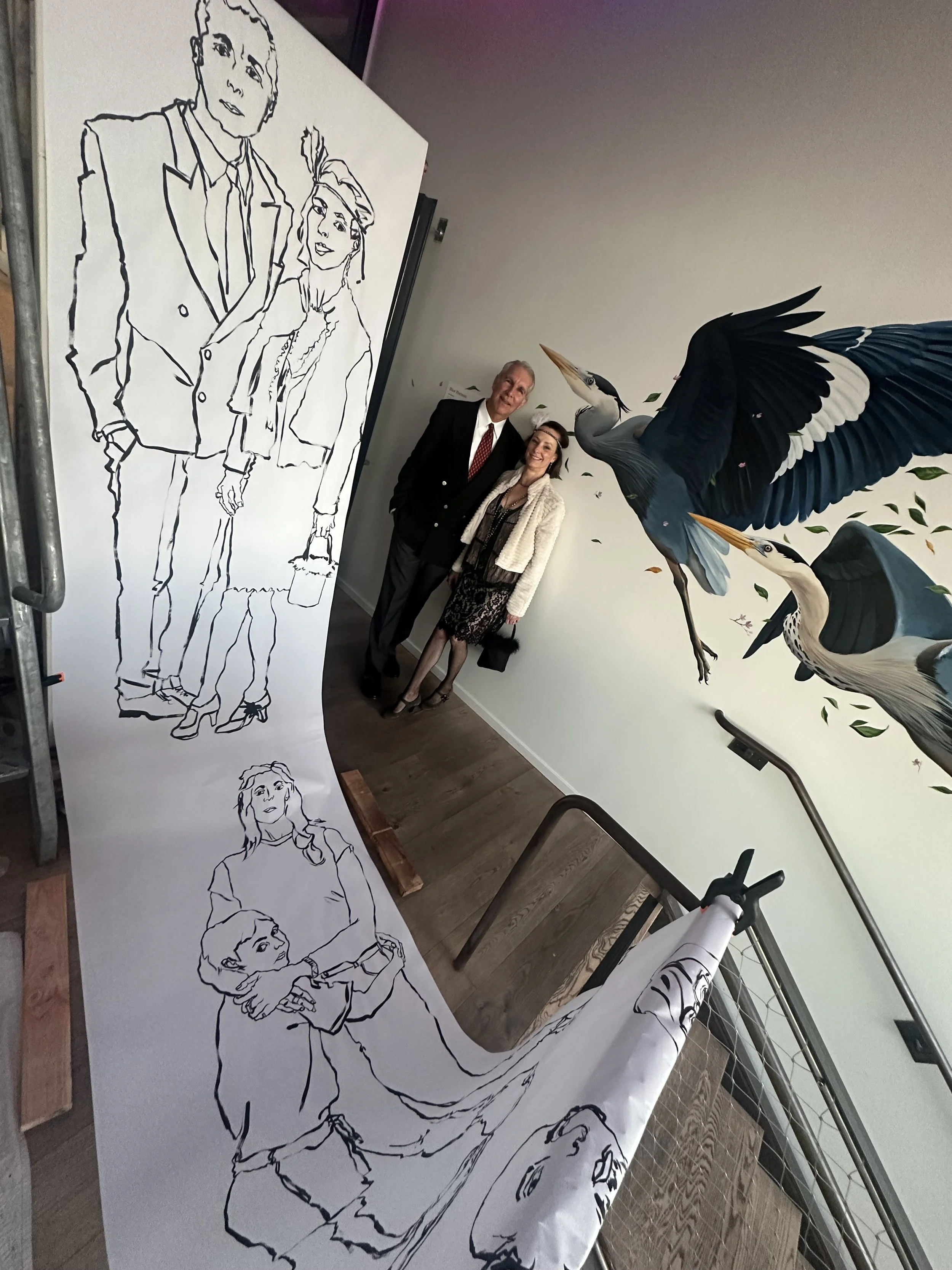 βOn February 8th, Artist Alice Warnecke Sutro performed a marathon drawing session of 20 couples in 12 hours, drawing couples onto a long scroll descending from her hand built large easel located on the top floor of the Harmon Guest House four story light well. The finished piece remained intact and hanging until February 14th, after that time participants were invited back to cut off and claim their portrait. Each double portrait takes 30-40 minutes and there is no erasing.β